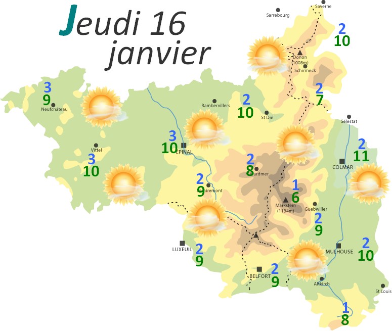 Côté températures, nous peinerons encore pour atteindre le barre de la gelée et en journée, les thermomètres s'affoleront à nouveau avec plus de 10 °C en plaine. Seul changement par rapport à ce mercredi, le vent, sensible jusqu'à présent, le sera beaucoup moins demain.